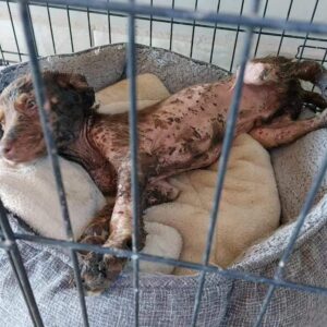 Two helpless puppies scrounging for food in Hermosillo, Mexico, wandered into a construction site and tragically fell into a scalding hot tar pit. The thick hot, sticky, black substance molded to their bodies, completely trapping them there for nearly a full day. These innocent babies were in a state of panic and shock from the pain, yelping until a construction worker discovered them and alerted us to their dire situation. Our Mexico team, run by Vidas con Causa, arrived to a heartbreaking scene. The puppies were in unimaginable pain; their cries of agony were haunting. Yet, in the midst of this horror, an incredible group of people from our rescue team and a kind-hearted elderly neighbor, as well as volunteers from rescue groups in Hermosillo, rallied together to save these innocent lives. It took nearly an entire day to clean the little dogs up, but they miraculously survived. We named them Courage and Hope.